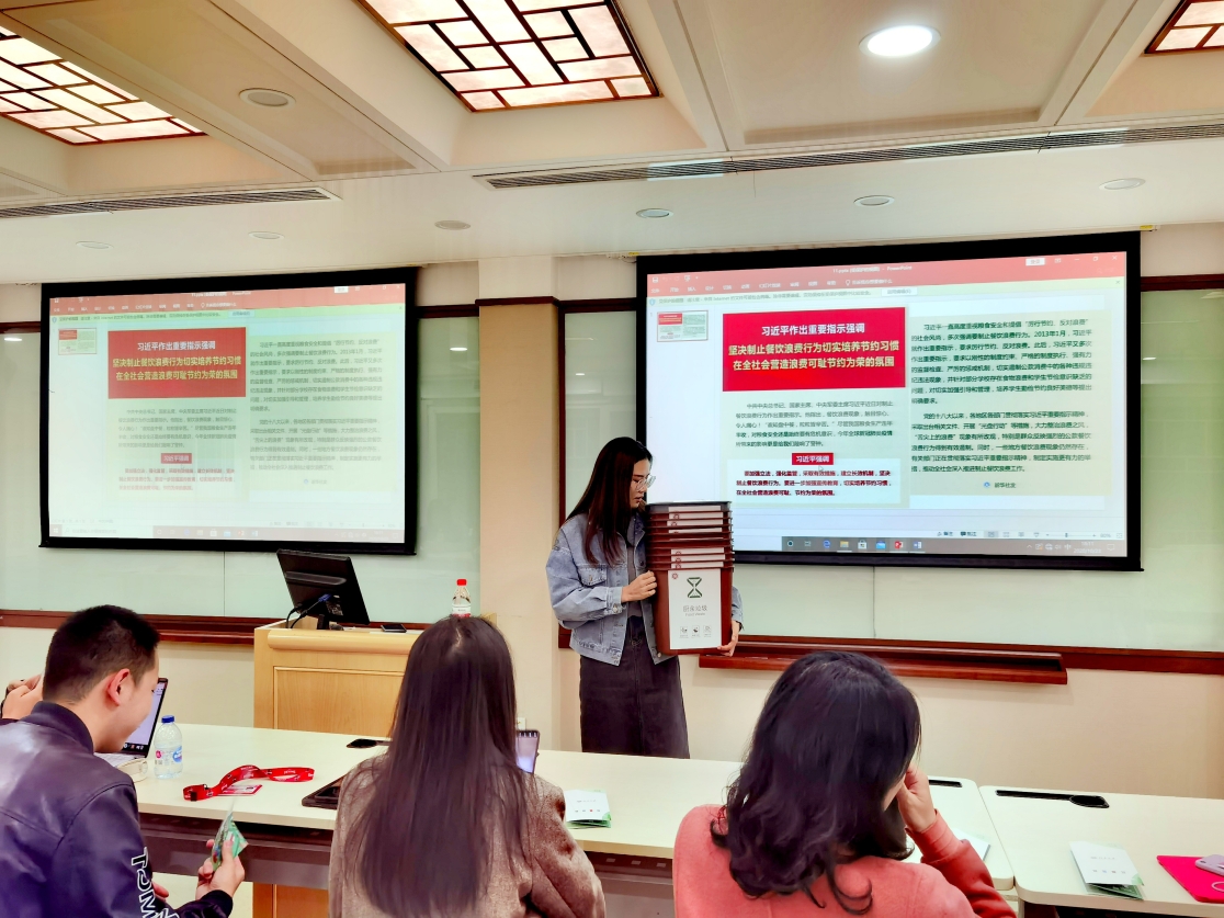 随后,戴之依带领同学们学习了习近平总书记对于“坚决制止餐饮浪费行为切实培养节约习惯,在全社会营造浪费可耻节约为荣的氛围”的重要指示精神,详细解读了节俭的重要意义,并提出三点倡议:优先选择半份菜,选择小份菜、外出就餐时未吃完打包。