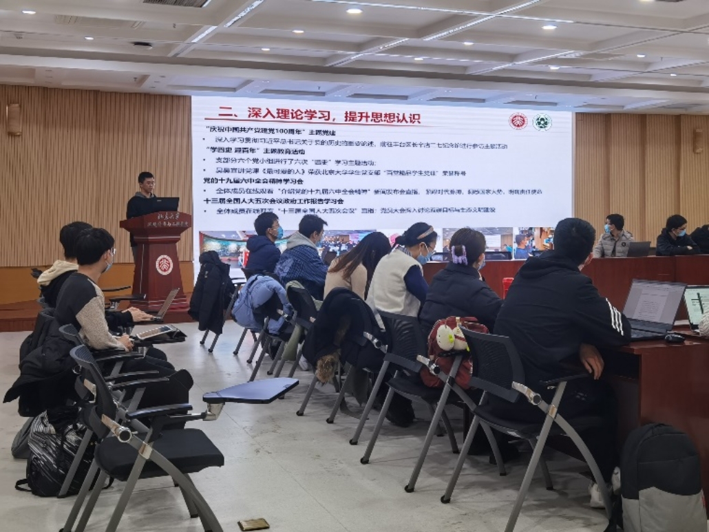 林鹏昇代表党支部委员会报告了上一年度党支部工作开展情况。党支部加强队伍建设,创新“党员领跑员”制度,队伍建设工作保持规范化。深入理论学习,以建党百年为契机,通过主题参访、党课赛讲、集体学习、小组讨论等方式,引导支部成员把思想真正统一到党的最新精神上来。探索特色党建,携手燕园街道党支部共同开展打造“红色1+1”共建项目,助力社区生态文明建设。勇担社会责任,搭建勤工助学平台,支部成员服务奥运盛会,打造支部鲜明服务标签。此外,林鹏昇查摆支部工作中存在的问题,并提出了具体整改措施。