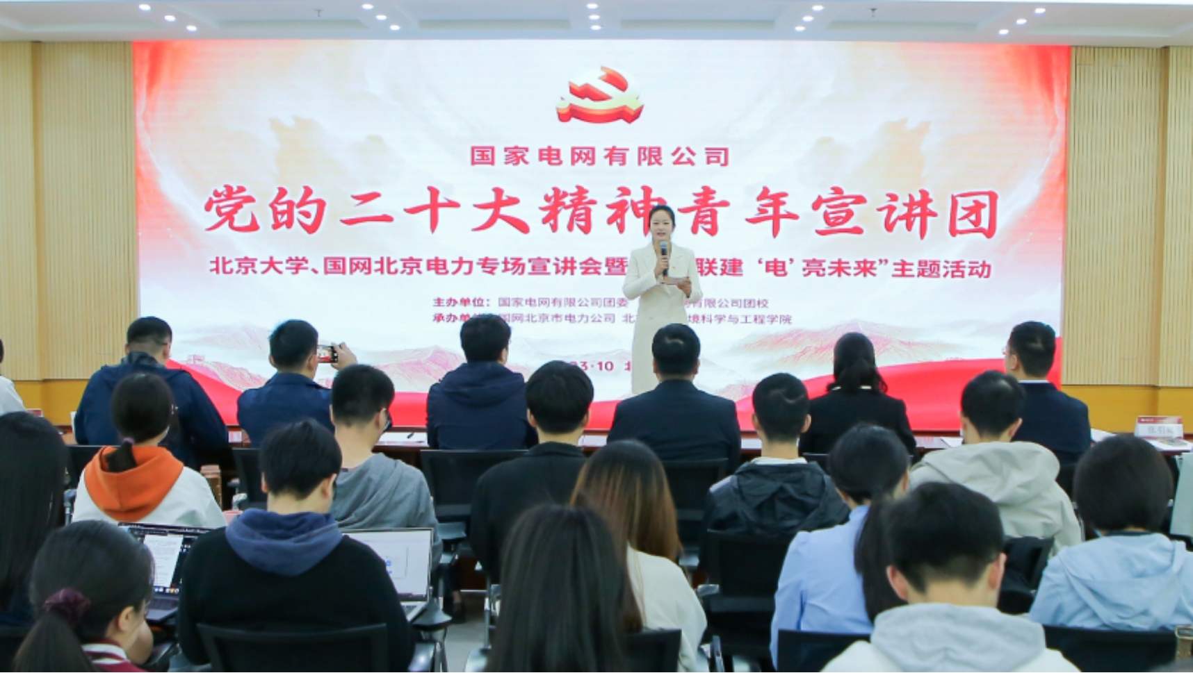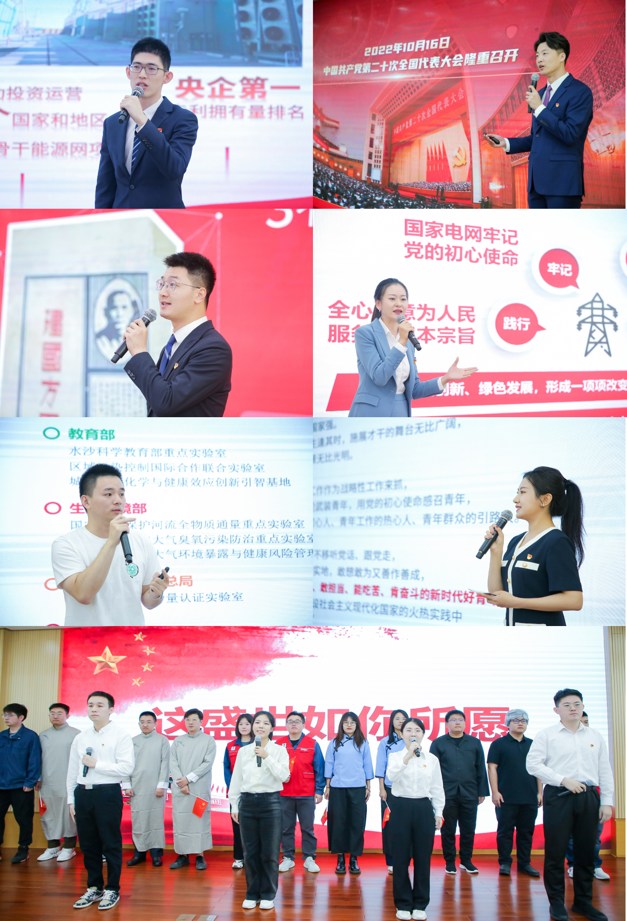 国家电网“党的二十大精神青年宣讲团”成员围绕“非凡十年谱华章、思想之旗领航向、人间正道开新篇、坚定不移抓落实、团结奋斗正当时”五个篇章,以青年视角讲述新时代国家电网的伟大变革和发展历程,描绘“大国重器”背后国家电网人和国家电网青年的奋斗蓝图。国网北京电力“青马工程”学员代表生动演绎情景剧《青春之我 奋斗有我》,诠释五四精神在国网青年身上的传承,展现当代青年勇担重任、昂扬向上的精神风貌。学院2021级博士生第一党支部书记张少轩从高校青年视角,分享学院研究团队在能源转型、“气候-环境-碳中和”、“区域能-水耦合”等领域的进展,介绍新时代北大环院人为绿色低碳发展和国家能源安全贡献的智慧和力量。