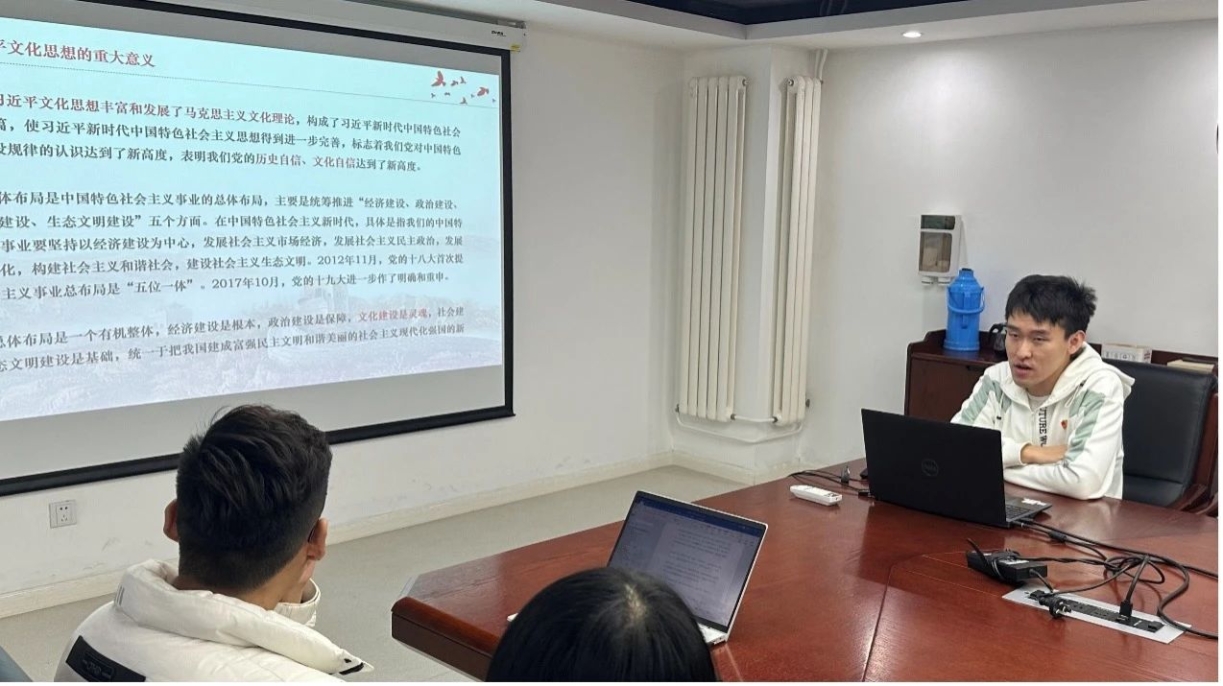 会上,支部组织委员房文旭领学,从学习贯彻习近平文化思想主题出发,带领大家深刻把握习近平文化思想的创新突破和部署要求。习近平文化思想是在继承发展党成立以来领导文化建设探索成果和宝贵经验的基础上,在新时代文化建设的伟大实践中形成并不断丰富发展而来。房文旭同志着重分享了总书记提出的“七个着力”重要要求,引导大家深入了解习近平文化思想“明体达用、体用贯通”的重大意义,激励在场同志坚持学以致用,以习近平文化思想作为开展工作的科学行动指南,以高度的文化自信和历史自信凝聚民族复兴力量,共同创造属于我们这个时代的新文化。