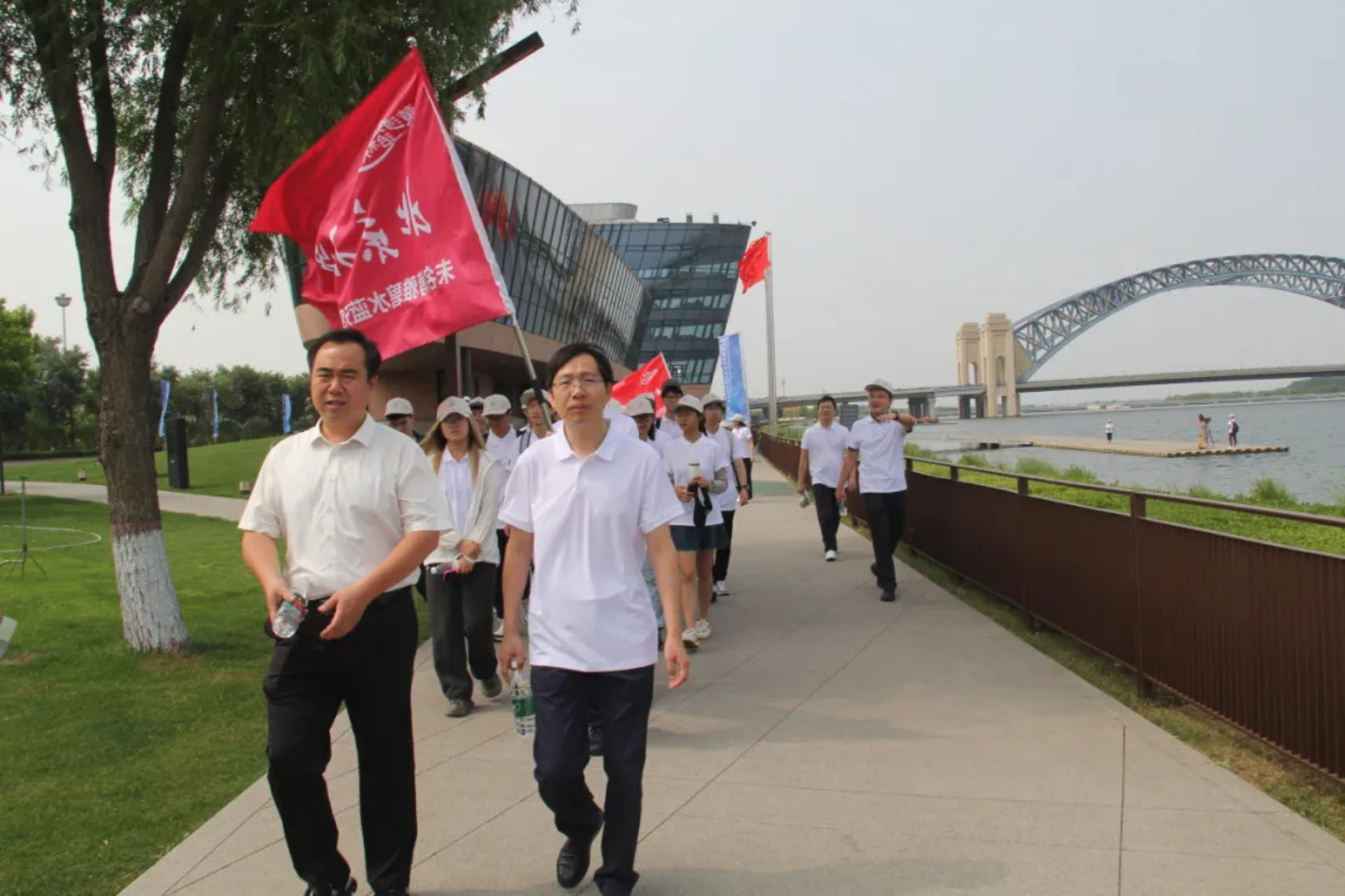 在汾河太原城区段,思政实践团重走总书记调研路线,了解汾河治理和两岸生态保护情况。两岸风景秀丽、河水波光粼粼、清风徐来,同学们深刻体会到生态环境改善给人民带来的幸福感。