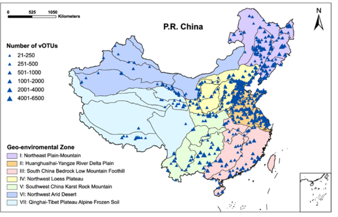 全国地下水中病毒分类单位(vOTUs)地域分布