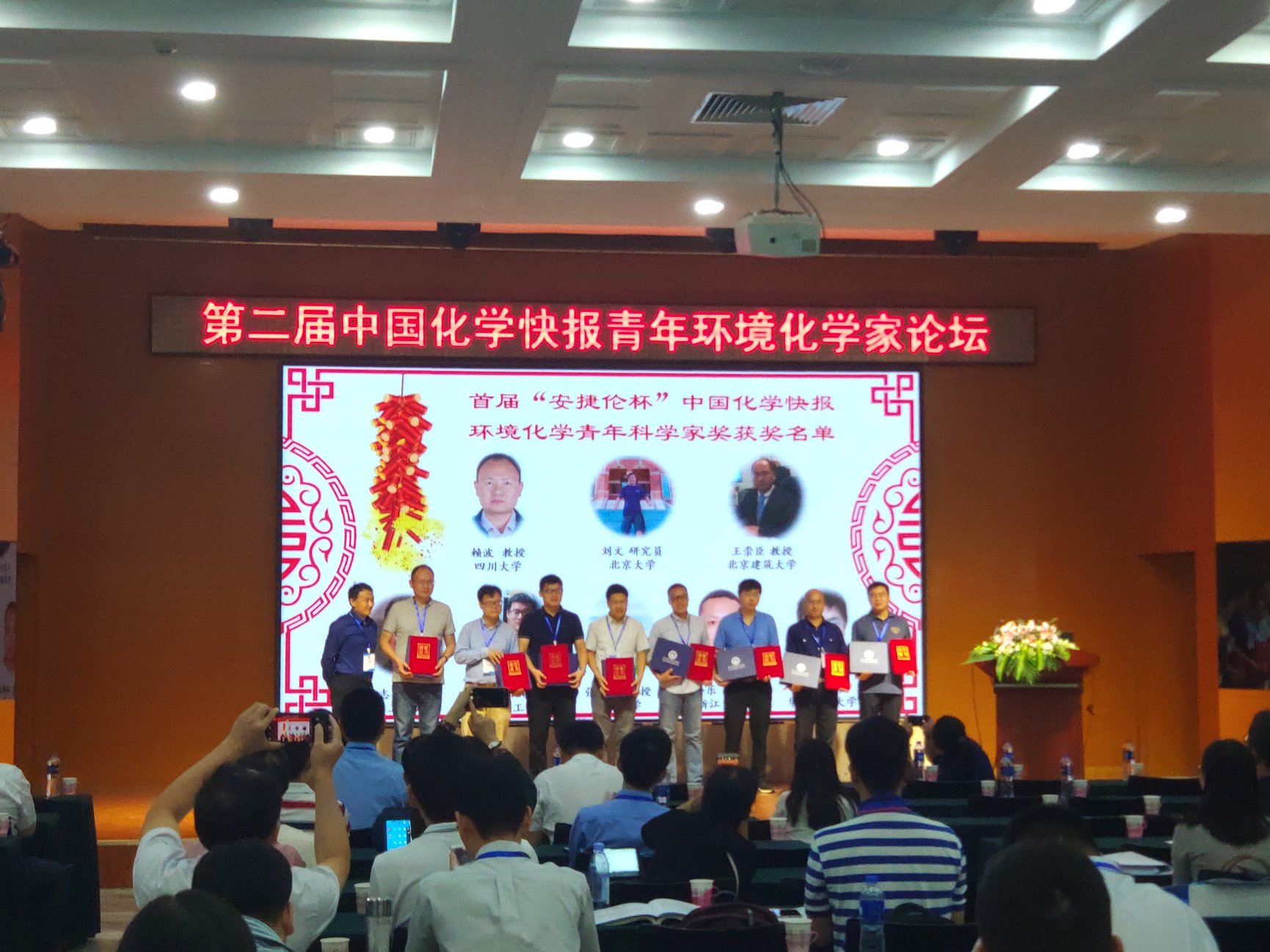 本次会议还设立了中国化学快报环境化学青年科学家奖,奖励中国环境学科青年工作者,特别是从事环境化学相关研究领域的中国化学快报编委会青年编委,鼓励更多的中国环境青年学者支持中国本土期刊,将优秀的成果写在祖国大地上。该奖项经专家推荐、学者自荐、编辑部核定、专委会会议讨论投票评选,首届共产生8名获奖者,分别是四川大学赖波教授、北京大学刘文研究员、北京建筑大学王崇臣教授、广东工业大学敖志敏教授、华东理工大学邢明阳教授、复旦大学张立武教授、华中科技大学付杰教授和浙江大学翁小乐副教授。安捷伦科技(中国)有限公司作为该奖项的冠名单位,市场部项目经理王海鉴先生和市场部活动专员刘燕萍女士为8位获奖青年学者颁发了首届“安捷伦杯”中国化学快报环境化学青年科学家奖,王海鉴先生对获奖者表示祝贺并发表寄语。