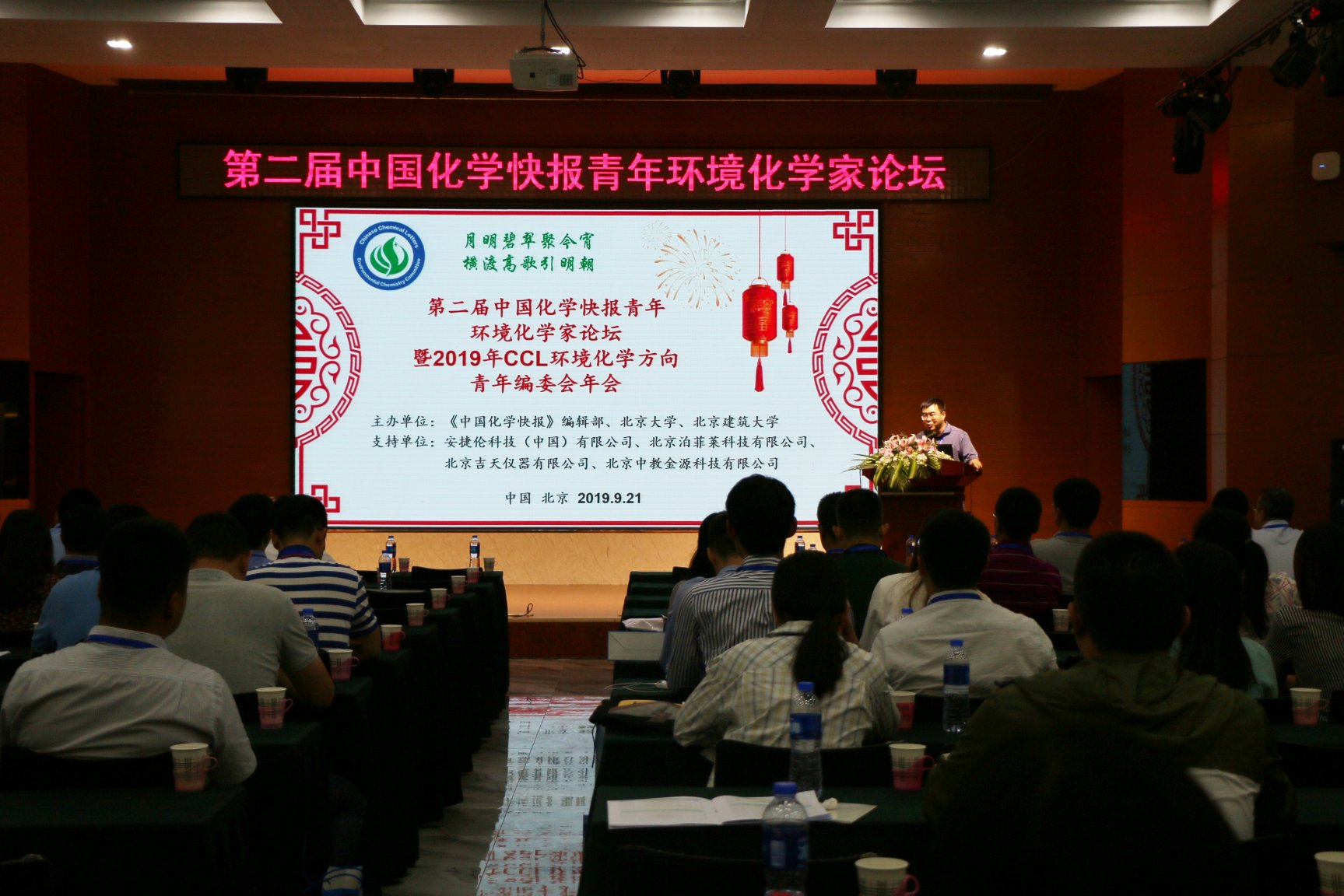 2019年9月21日,第二届中国化学快报青年环境化学家论坛在北京开幕。本次会议由《中国化学快报》(Chinese Chemical Letters,CCL)编辑部、北京大学和北京建筑大学联合举办,北京大学环境科学与工程学院、北京大学水沙科学教育部重点实验室、北京市工程科学与新兴技术高精尖创新中心、北京市新型污水深度处理工程技术研究中心、北京大学区域污染控制国际合作联合实验室、国家环境保护河流全物质通量重点实验室、建筑结构与环境修复功能材料北京市重点实验室承办,安捷伦科技(中国)有限公司、北京泊菲莱科技有限公司、北京吉天仪器有限公司、北京中教金源科技有限公司为本次会议的支持单位。来自北京大学、清华大学、中科院生态环境研究中心、哈尔滨工业大学、同济大学、复旦大学、中国科学技术大学、南开大学、浙江大学、中山大学、南方科技大学等120余所高校、科研院所、环保企业和仪器设备公司的200多位环境领域青年学者和技术专家齐聚北京,交流环境领域最新研究成果,从青年学者角度探讨环境化学领域的未来发展方向。本次会议的主题为“月明碧翠聚今宵,横渡高歌引明朝”。会议旨在提升我国环境化学的国际化水平,推动我国科技期刊发展的步伐,为中国的环境化学青年工作者搭建交流平台。我院刘文研究员、陆克定研究员、郭松研究员、刘思彤研究员、童美萍研究员、王婷工程师等老师参加本次会议并做学术报告。