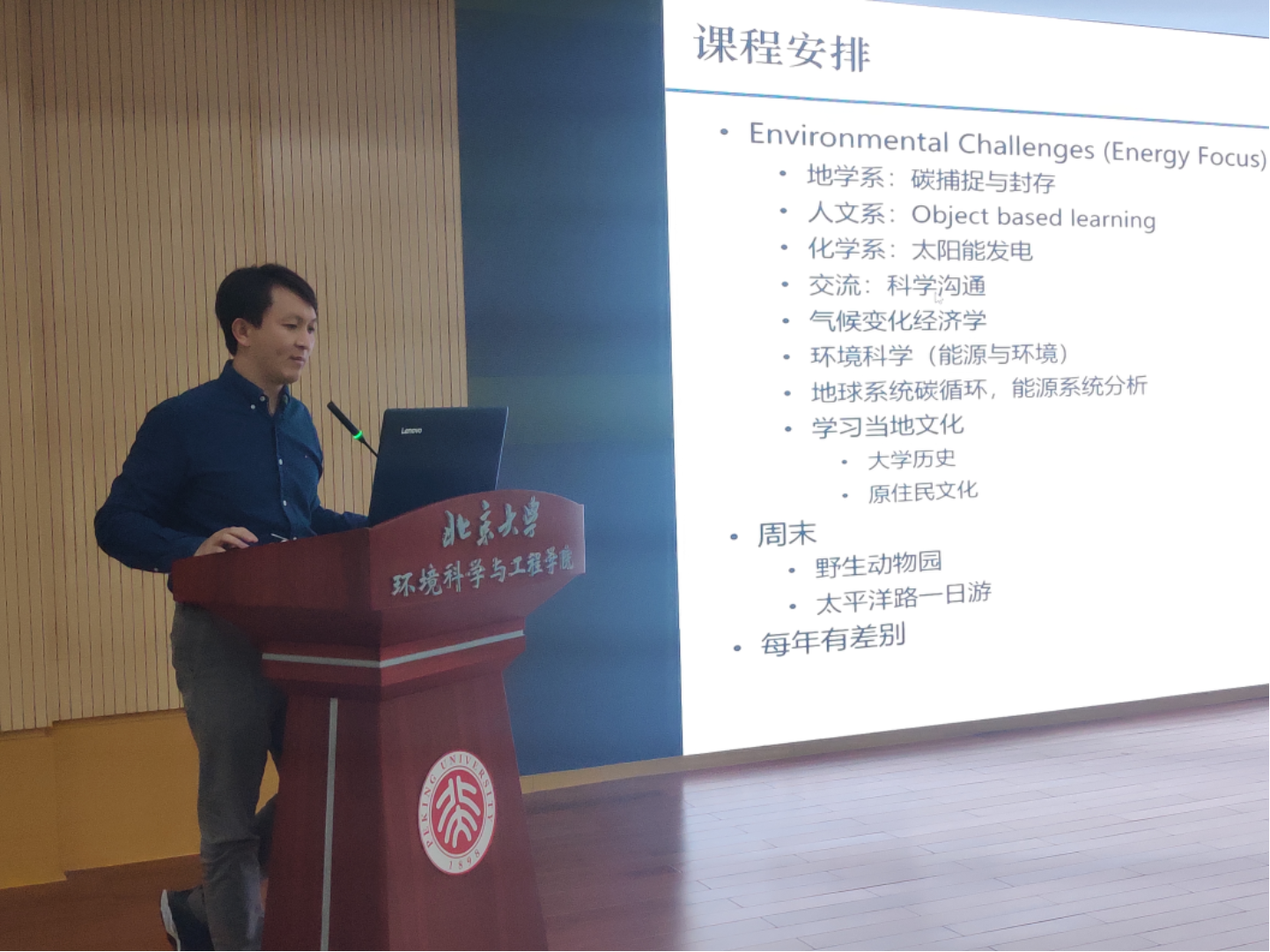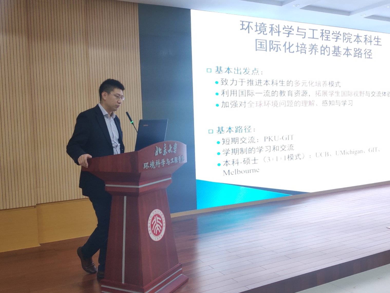 王奇老师对学院本科生国际交流的基本情况进行了总体介绍。目前,学院秉持“全国领先、国际一流”的教学目标,开设了丰富多彩的多层面国际交流活动,包括非学位的短期交流项目以及长期的学位联合培养项目。王奇老师指出,国际化是北京大学环境学院的未来发展趋势,鼓励本科生积极参与、踊跃申请,开拓自身视野,丰富科研经历,将中国智慧与国际视野结合起来。