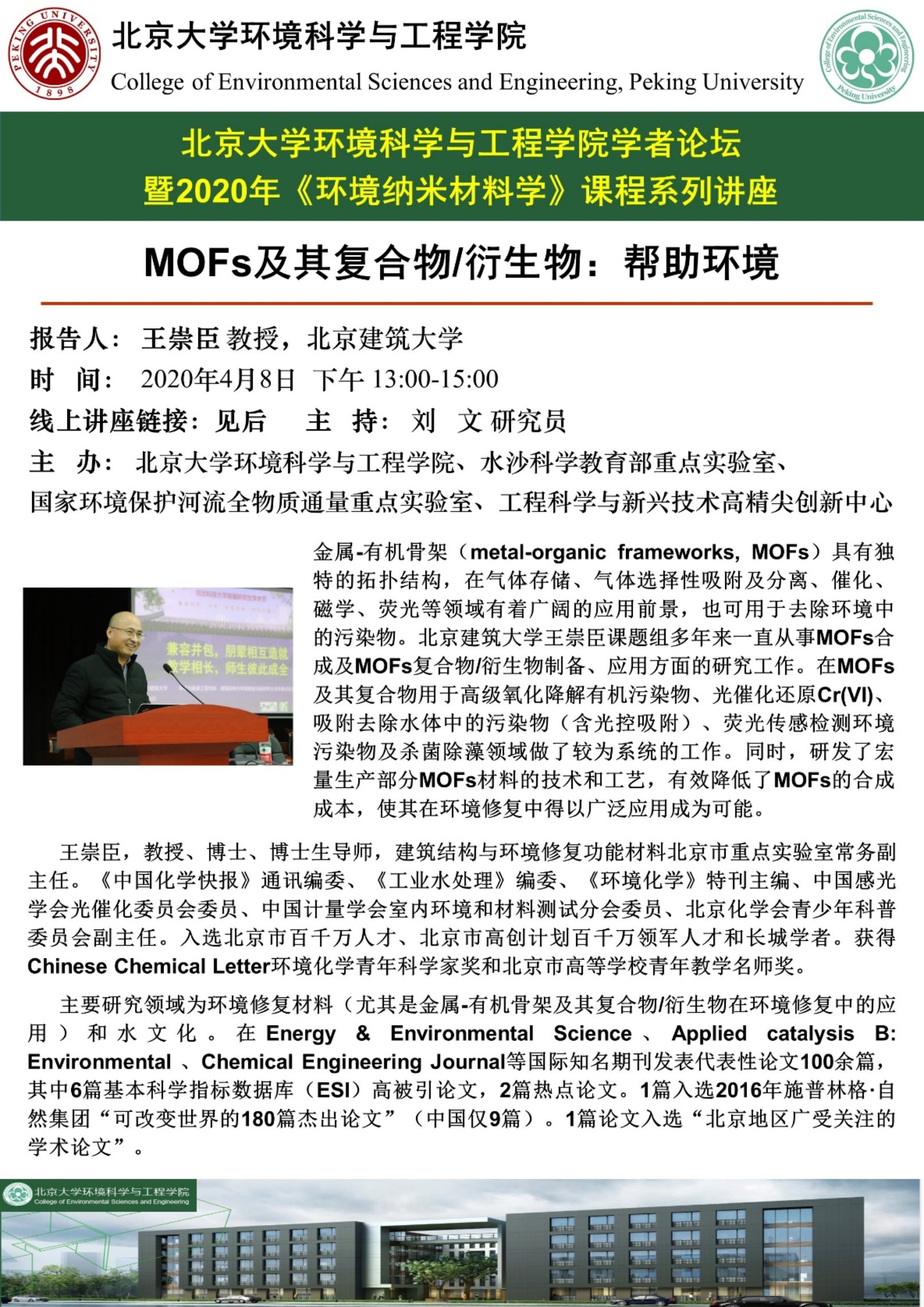 《环境纳米材料学》是北京大学环境科学与工程学院刘文研究员开设的针对环境纳米材料与技术的研究生进阶课程,课程旨在全面介绍环境功能纳米材料的架构原理,材料合成与表征,以及纳米材料环境应用(Application)和纳米材料环境行为启示(Implication),使学生在深入全面掌握环境纳米技术的基本原理的同时,在专业深度上透彻了解环境纳米材料学科的研究方法和发展趋势,了解如何应用纳米材料解决环境问题。按照教学计划和课程安排,3月8日下午的课程特意邀请了国内环境MOFs材料专家、北京建筑大学王崇臣教授为大家带来“MOFs及其衍生物:帮助环境”的专题讲座。为响应国家抗疫要求,讲座采用了线上授课的方式。本次讲座除本学期选课学生参与外,还吸引了来自海内外的500余名师生参与了线上互动或观看了同步在线直播,课程讲座的影响力大、辐射范围广、反馈好。