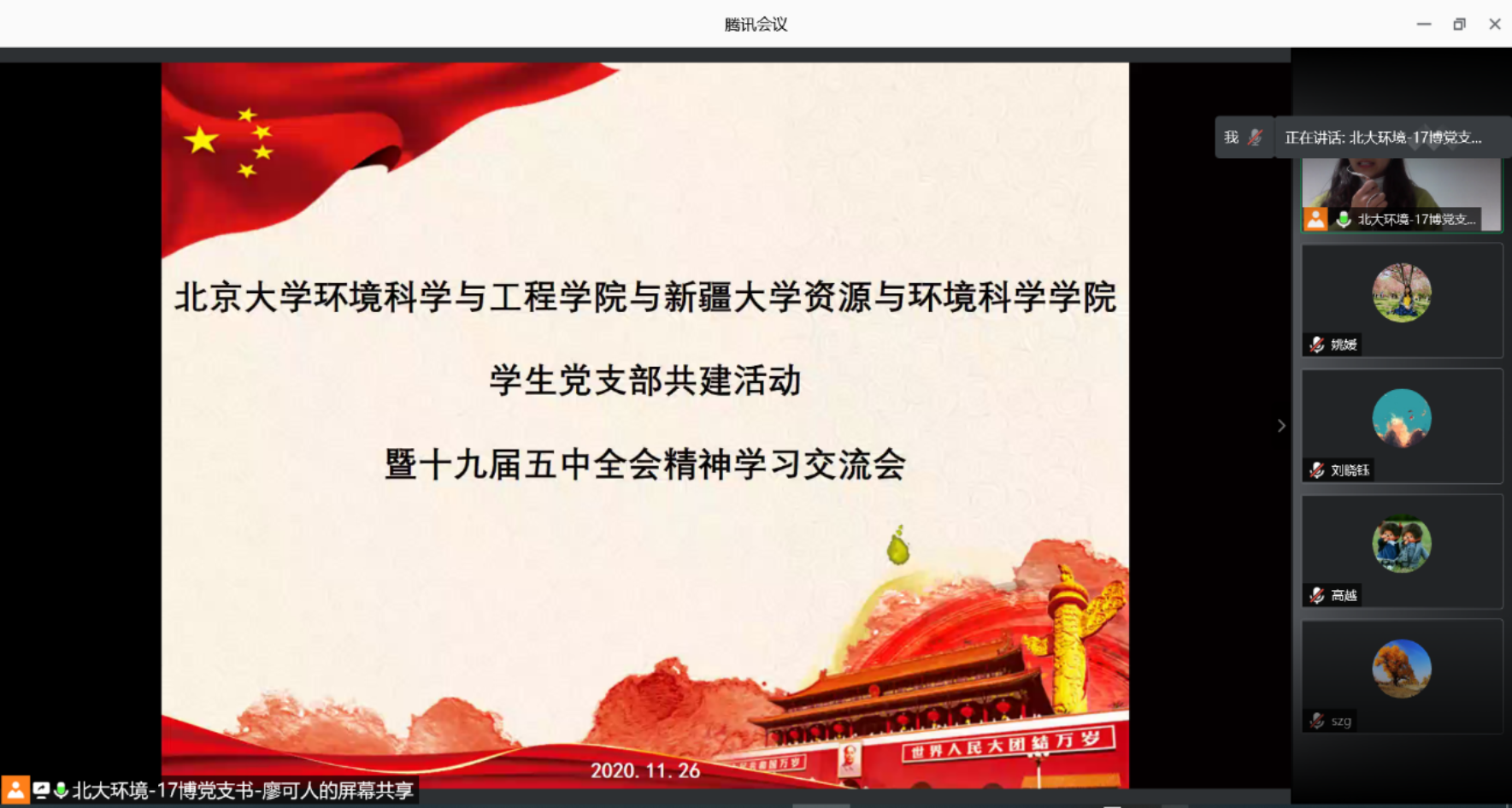 11月26日晚,北京大学环境科学与工程学院2017级博士生党支部与新疆大学资源与环境科学学院博士生党支部开展线上支部共建活动,共学十九届五中全会精神。北京大学环境科学与工程学院党委委员、副院长刘永,团委书记吕丽,新疆大学资源与环境科学学院党委副书记王新绘,团委负责人秦鹏参会指导。会议由北京大学环境科学与工程学院2017级博士生党支部书记廖可人主持。