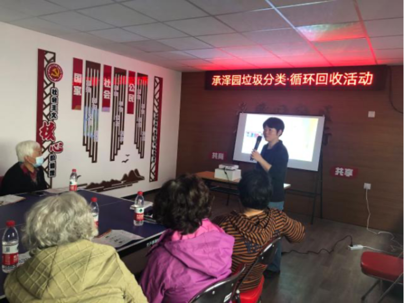 2021年4月23日下午,在垃圾分类实行一周年即将来临之际,共建双方在承泽园社区组织开展社区“垃圾分类·循环回收”活动。环境科学与工程学院副教授韩凌现场演示通过“家庭堆肥”实现厨余垃圾变废为“肥”的方法,指导社区居民进行厨余垃圾本地消化再利用,最终实现社区厨余垃圾减量化,达到减轻市政垃圾运输处理压力的成效。城市与环境学院副教授童昕介绍了参与环保公益回收的基本流程,采用公益金、兑换环保积分和现有收回人员合作等方式调动居民分类的积极性,推动居民习惯养成。