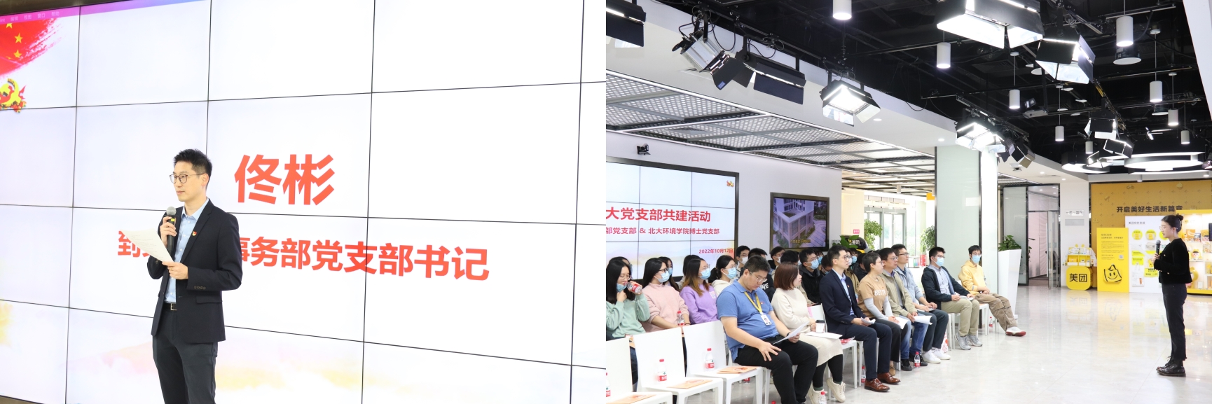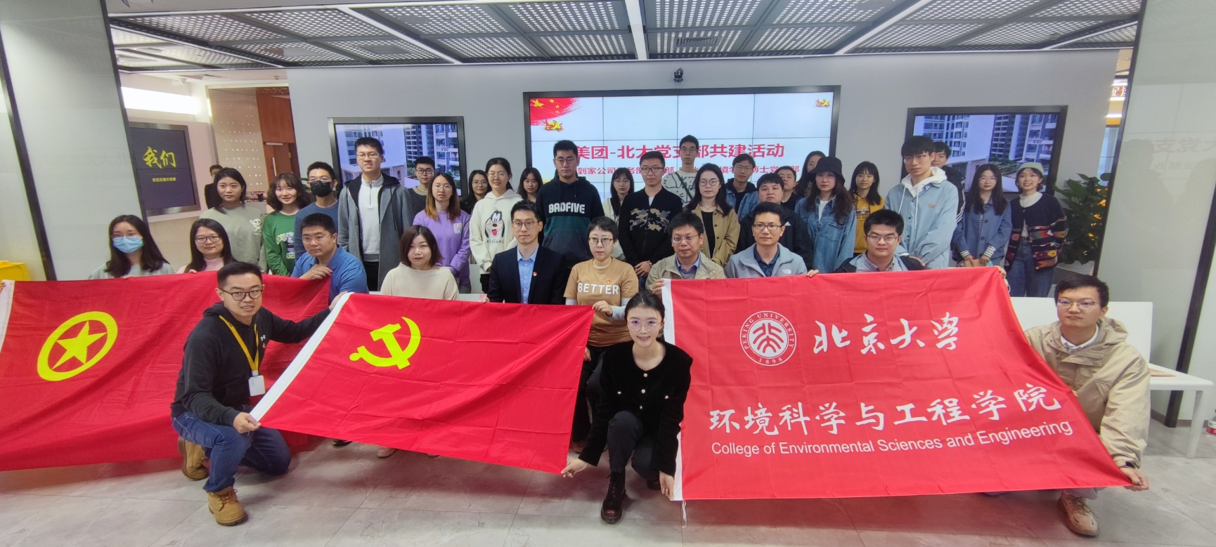 为迎接党的二十大胜利召开,深入学习贯彻习近平总书记系列重要讲话精神,积极响应国家“碳达峰、碳中和”战略目标,充分发挥党员服务精神和党支部战斗堡垒作用,10月12日上午,北京大学环境科学与工程学院2021级博士生第二党支部与美团到家公司事务部党支部携手共建,开展美团北京总部企业参访活动。环境科学与工程学院党委副书记陆克定、教师代表杨武霖、美团到家事业群党委书记杨碧聪、美团到家公司事务部党支书佟彬、组织委员赵子康、美团“青山计划”青山科技基金负责人管沥等参加本次活动。