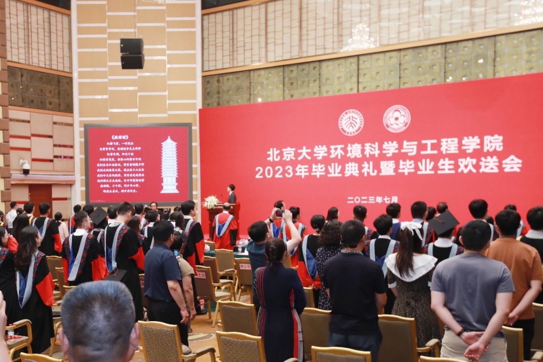 在庄严的国歌声中,毕业典礼拉开序幕。与会师生、嘉宾、亲友们通过开场视频,一同回顾了北大环境学科50年所走过的峥嵘岁月。