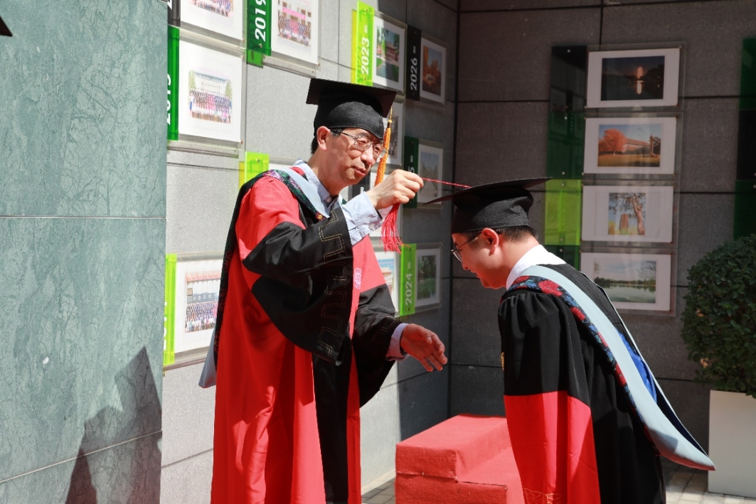 在毕业典礼前,学院还在环境大楼中庭举行了毕业红毯和学位授予仪式。王奇宣读毕业生名单,各位毕业生携手导师、亲友依次走过红毯、穿过学位门,朱彤和李振山为其拨穗正冠并合影留念。