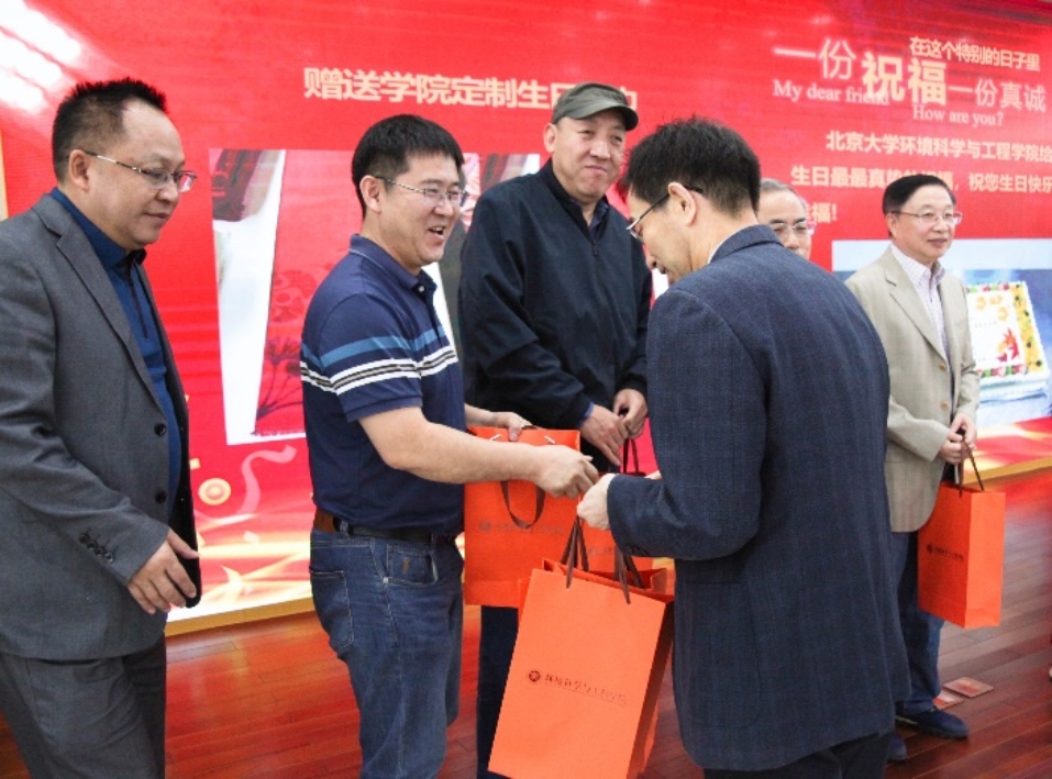 学院为每位寿星定制了一条蕴含北大和环境学院特色的围巾作为礼物。学院班子成员为寿星们送上礼物。