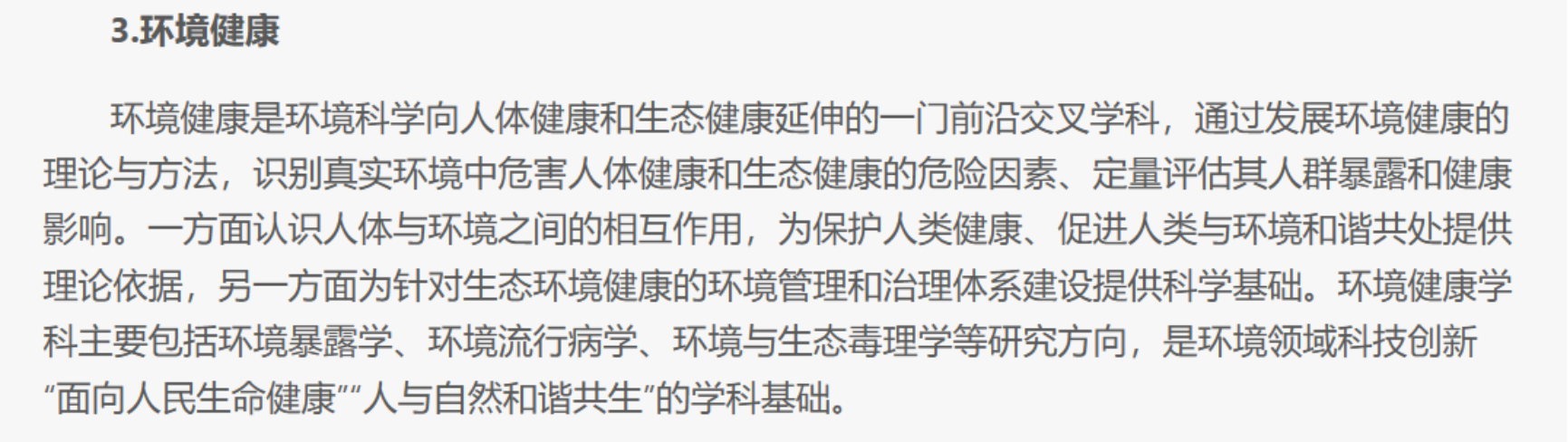 近日,中国学位与研究生教育学会官网发布《研究生教育学科专业简介及其学位基本要求(试行版)》,该文件由国务院学位委员会第八届学科评议组、全国专业学位研究生教育指导委员会根据国家发展需要和知识体系更新演化编修而成。文件显示,环境健康已被列入二级学科目录,成为继环境科学、环境工程后,环境科学与工程一级学科下第三个正式的二级学科。