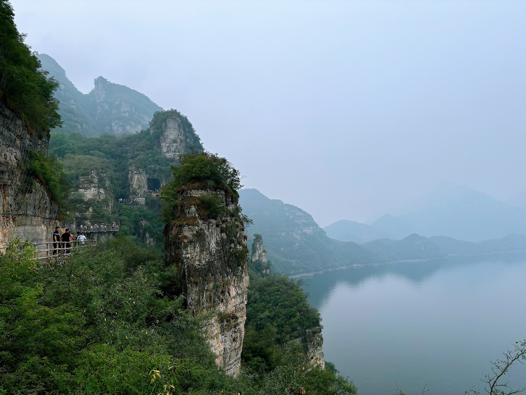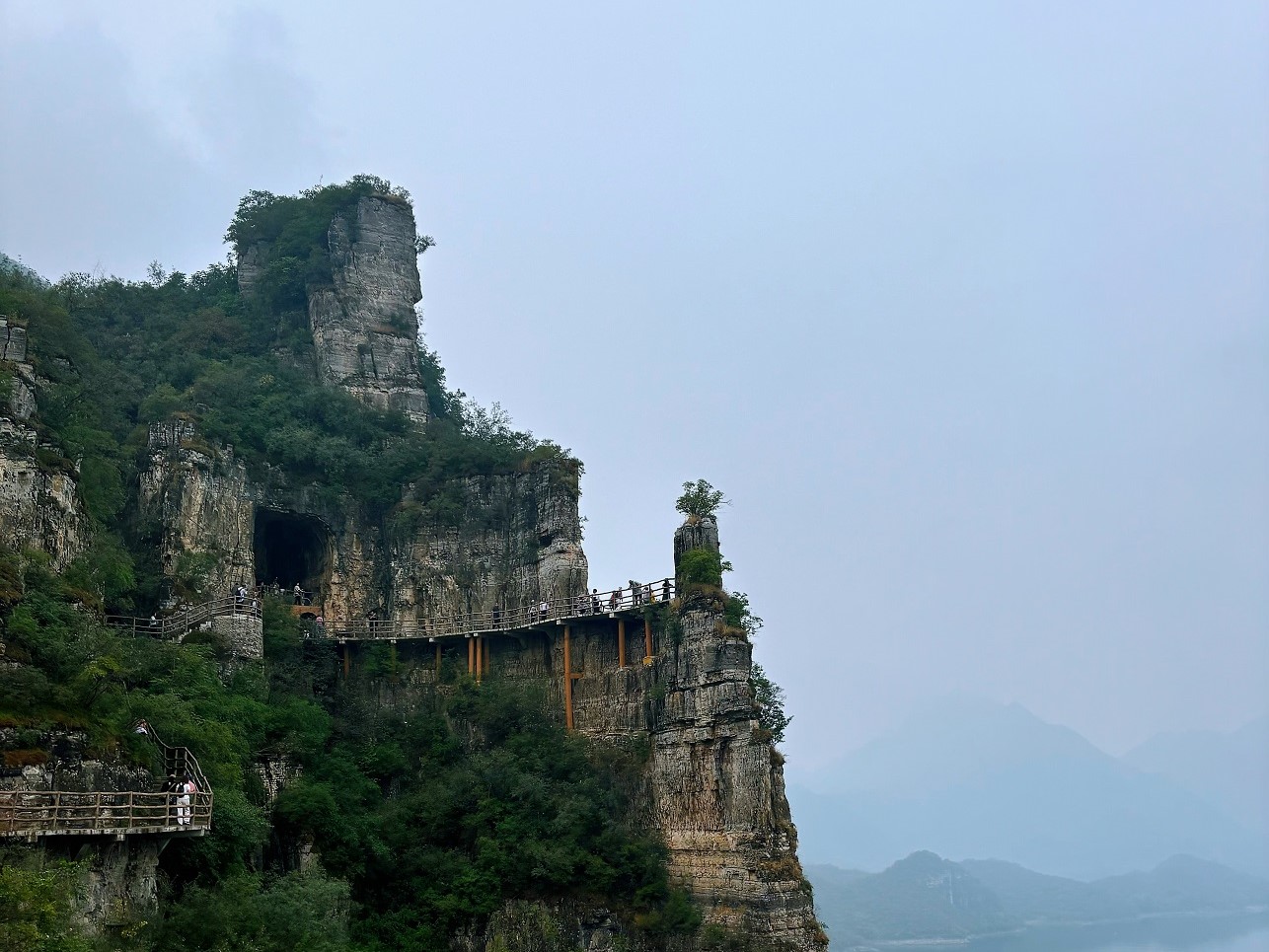 漫步在栈道上,教职工们边走边聊,分享着工作与生活中的点滴趣事,欢声笑语交织成最动人的旋律。大家边走边赏,细细品味着湖光山色间的宁静与美好。从大道之源、天地根,到无为屏、天门云梯、观水,一路上的12处景点各具特色,每一处都让人心旷神怡,雾色缭绕间仿佛置身于人间仙境。