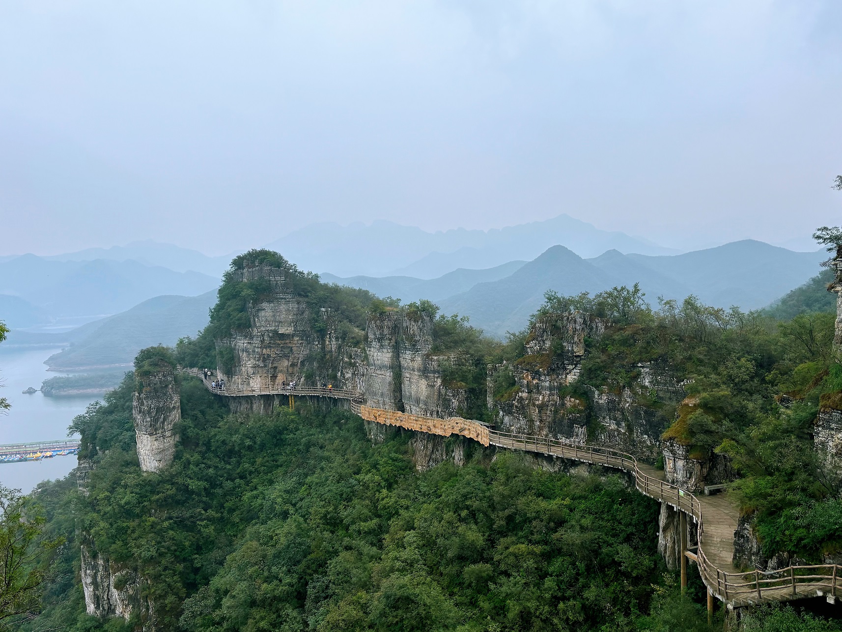 清晨,学院30余位教职工及家属在学院集合,一同踏上前往易水湖的旅程。易水湖四面环山,背靠紫荆关,东临清西陵,西连五峰寨,南望狼牙山,因与漓江风光相媲美,被称为“北方小桂林”。抵达目的地后,大家结伴而行,踏上了老子峰3100米长的临水观景栈道。这条栈道蜿蜒曲折,宛如一条“蛟龙”般蜿蜒缠绕在山间湖畔,每一步都铺陈着迷人的景色。栈道两旁,山石林立,造型奇特,仿佛大自然的鬼斧神工,让人叹为观止。