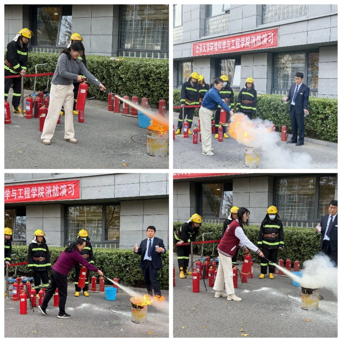 随后,全体人员开展实际灭火操作演练。由物业负责人模拟点火,讲解示范灭火器的正确使用方法,在场师生和物业工作人员轮流进行了实际操作,掌握了二氧化碳灭火器和干粉灭火器的使用方法。