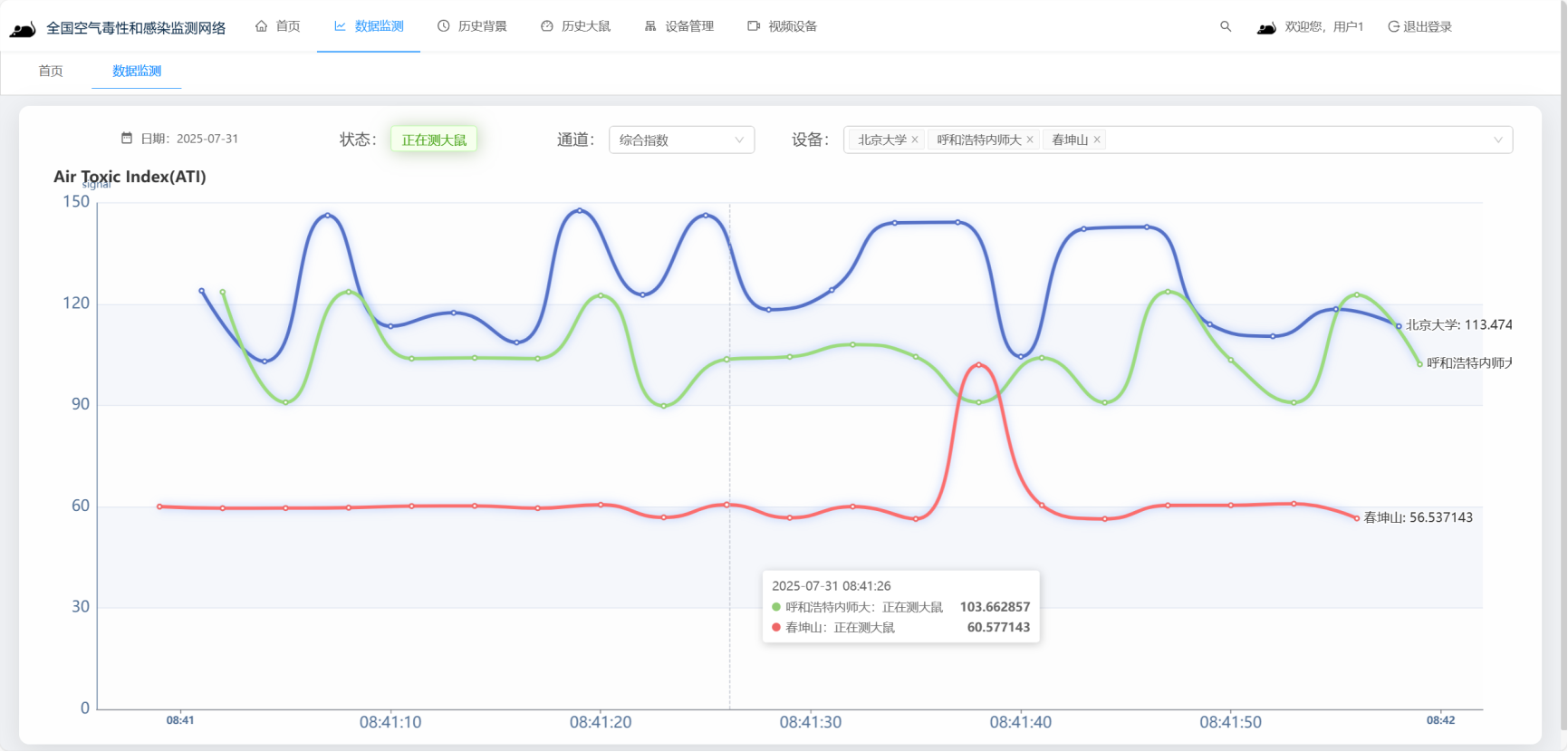 依托该观测站,北京大学联合内蒙古师范大学环境健康研究院、北京工匠生物科技有限公司目前同步开展“蒙古高原环境健康观测计划”。该计划已在北京、呼和浩特及春坤山观测站同时启动观测,旨在系统研究城乡大气环境异同及其健康关联,聚焦城市与生态区背景大气组分差异、环境污染对空气毒性的贡献、不同城市污染本底特征的解析。此次部署了传统的大气污染监测设备, 同时配备了基于大鼠的活体实时传感空气综合毒性系统以及人群健康标志物快速筛查体系。观测站的建成运行为该计划提供了不可替代的高原背景区域本底监测数据,将成为研究大气化学、环境健康等领域的重要区域性科研基础平台,为科学评估北疆生态系统健康状况、精准制定区域生态保护与污染防控策略提供关键数据与技术支撑。