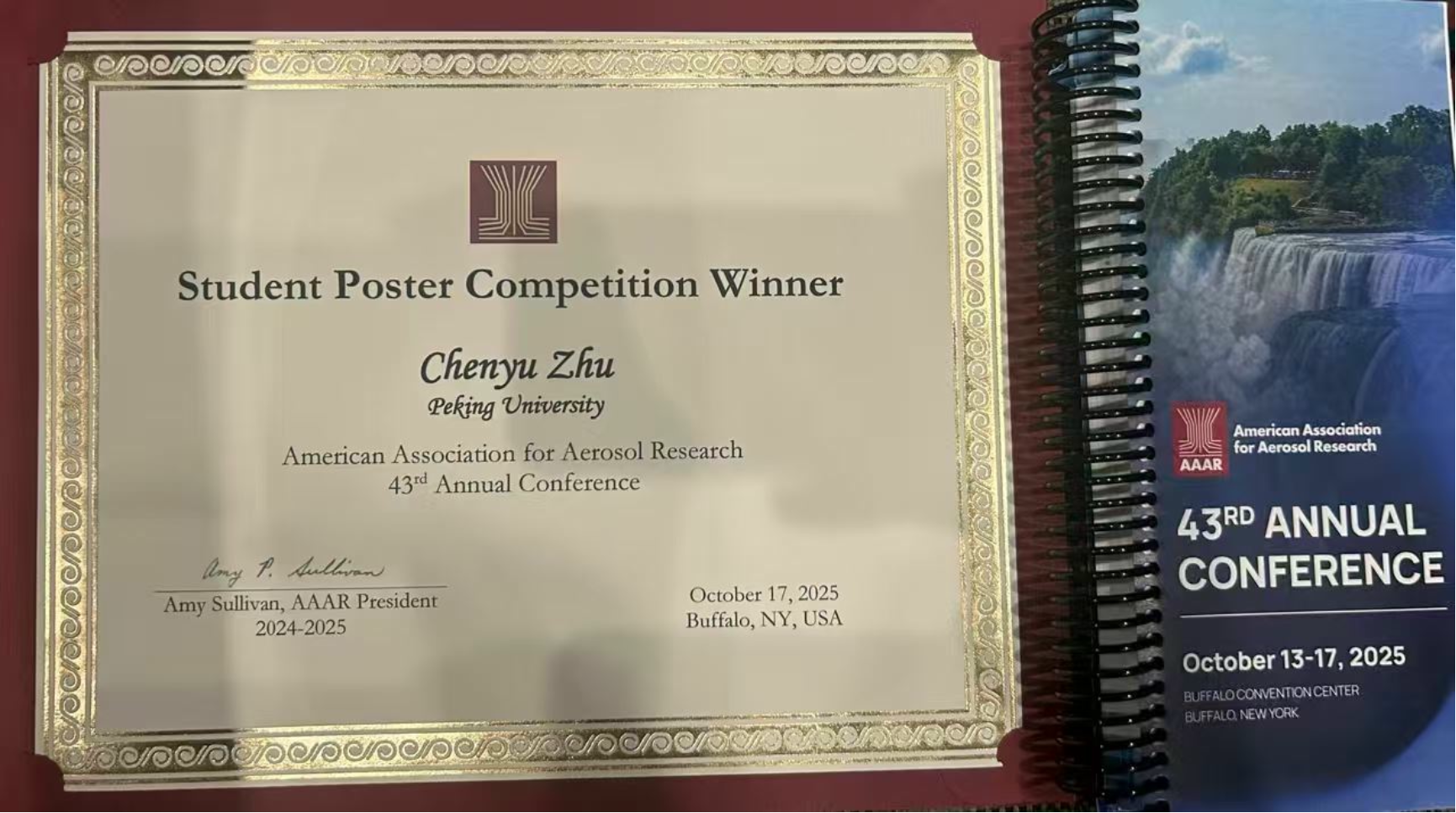 此前要茂盛教授团队的两名博士生(李菁、陈灏轩)均获得美国气溶胶协会的最佳博士论文奖,每年只颁发一位。朱晨宇的研究从大量的Poster中脱颖而出,该奖励的获得也是对其所开展研究在国际同行中的进一步认可。