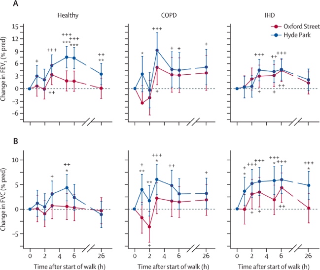 该研究通过严谨的随机交叉实验设计,选取了119名受试者,包括40名COPD稳定期患者,39名IHD患者,和40名年龄匹配的无心肺疾病的对照人群,让他们分别于英国伦敦牛津街(暴露点)和海德公园(对照点)正常行走 2小时。研究人员对行走期间的大气污染物,包括黑碳、细颗粒物(PM2.5)、可吸入颗粒物(PM10)、超细颗粒物、二氧化氮(NO2),以及环境噪声进行了观测。在实验之前、期间和之后的三个时段对受试者心肺系统的健康指标进行了多次、综合的观测。