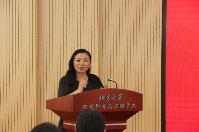 最后,张世秋老师作为学院教师代表,热情欢迎各位新同学加入环境人的队伍,并以《立/利于环境、做社会和自然的公民》的主题给同学们作开学第一课。首先,张老师用陈岱孙和唐孝炎两位北大老师的思想与实践举例,让同学们明白在北大、在燕园,有其底蕴、有其文化也会有其传承和发展。随后,她从环境学科的不同角度分享她的心得与感悟,提出环境学科除相关界定外,也应是一门研究人类如何以“文明”的方式彼此共处,并与自然和谐共生、共存的“学问”。她谈到,在大学中同学们应该具备健康的体魄、乐观的心态、精深的专业学养,还需要提高自己作为 “人”和“公民”的素养与能力,时刻提醒自己“我们都是人类社会的公民、也是自然界的公民”。她强调专业学习需要以兴趣为导向,深入发掘科学研究问题,“守正创新”,身为环境人我们需要眼界高远,脚踏实地。她以“读书、走路、阅人、历世/历事、成就/人生”与同学们共勉,并把公民环境行为准则概括为:“不以善小而不为、不以恶小而乱为”。最后,她呼吁所有学生一起努力,使环境学院能够:宽厚与精深并济、严谨与创新并重、严肃与活泼共存。