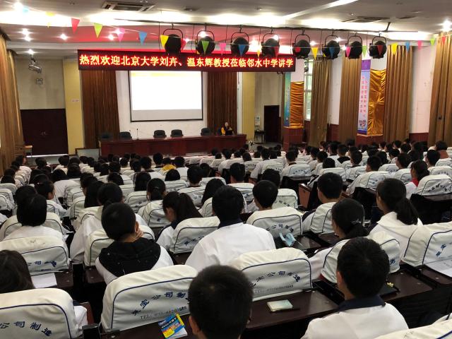 当日下午,北京大学环境学院师生在邻水中学进行了“环保学术讲堂”暨共建活动闭营仪式。刘卉老师和温东辉老师分别作了题为“环境与发展:人类社会的挑战”和“水环境的故事”的报告,并对邻水中学的高中生们发出邀请,希望他们来到北京大学,来到北京大学环境学院。
