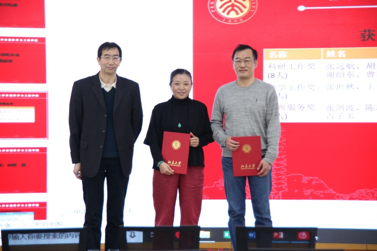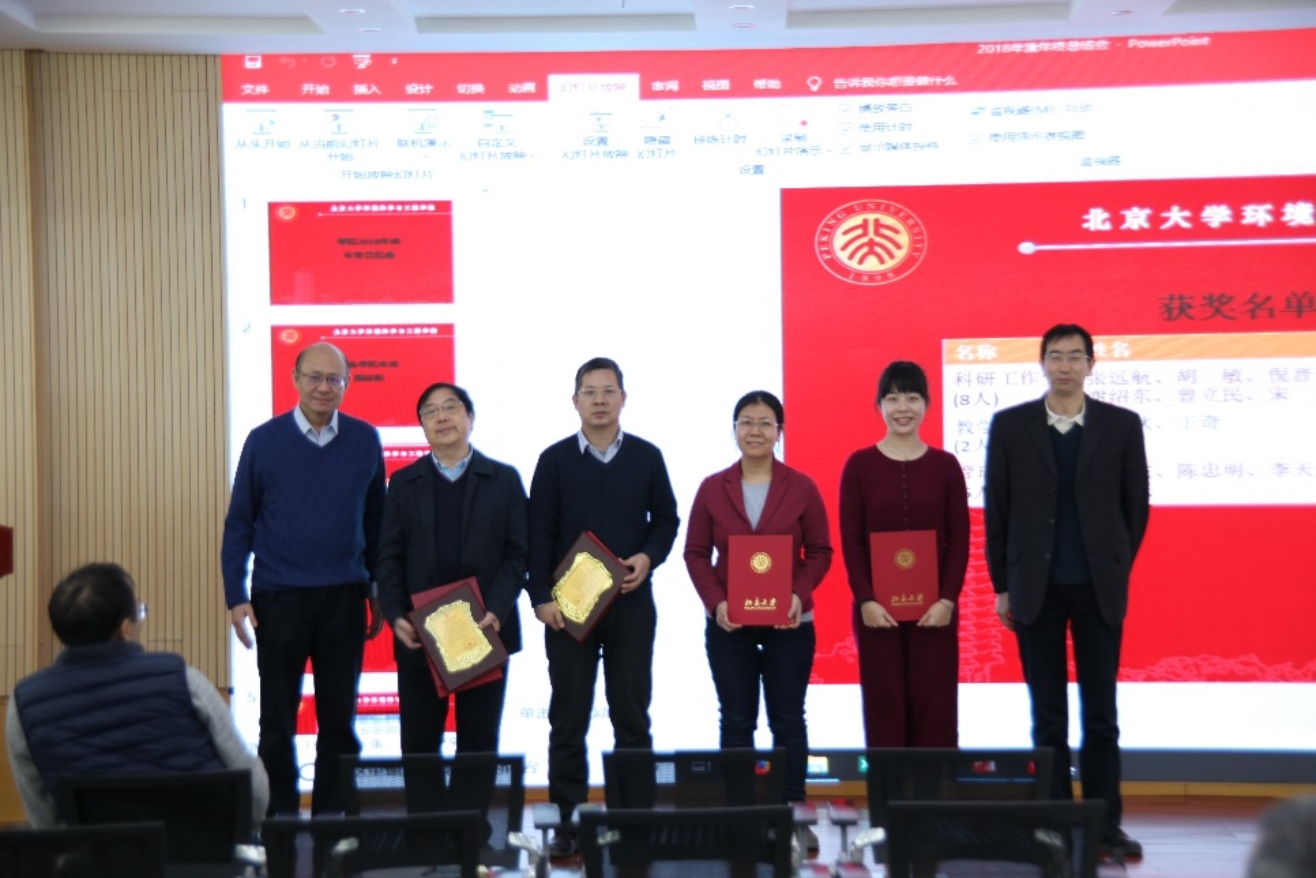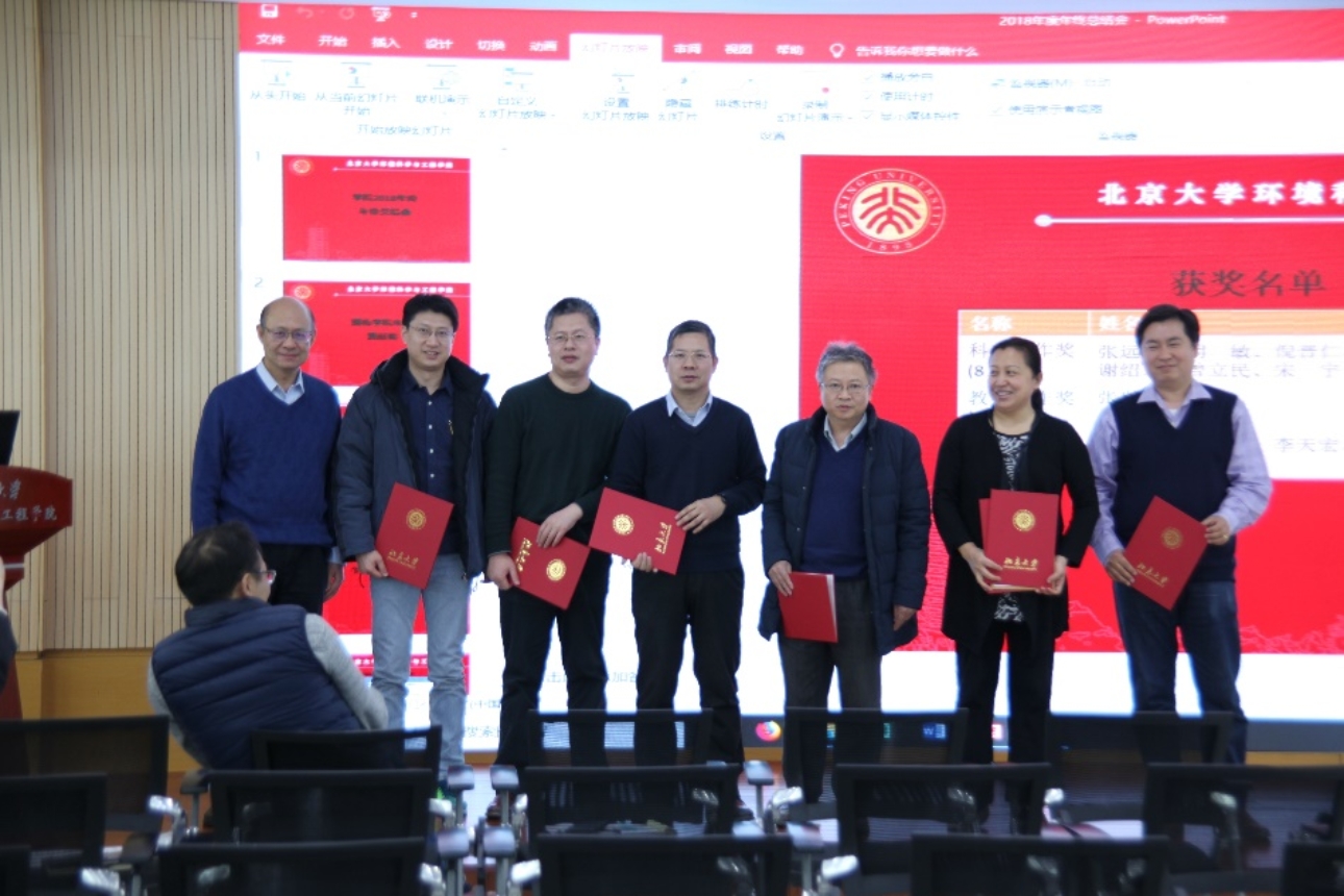 接下来,朱彤院长和李振山书记为2018年度贡献突出的老师们颁发奖状。奖项分别是:科研工作奖8人,教学工作奖2人,管理服务奖6人。