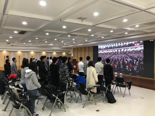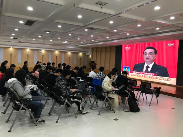此外,学院根据学生学习科研实际情况,除了组织师生代表在主会场集体学习,还在学生办公室、实验室等多个分会场组织了自主观看直播学习。2019年两会期间,学院还将继续在广大学生中采取多种形式组织开展两会主题学习教育活动,从而大力弘扬家国情怀,使同学坚定信念、敢于担当,与国家和社会并肩前行。