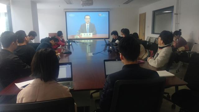 2019年3月15日,第十三届全国人大二次会议闭幕后,国务院总理李克强在人民大会堂金色大厅会见中外记者并回答记者提问。上午10点,北京大学环境科学与工程学院组织二十余位学生代表在环境大楼B112会议室集体观看了总理答记者问电视直播,直播前,专职辅导员杨森介绍了本次“两会”相关知识。
