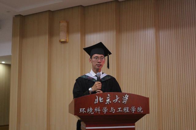 学院2015级本科毕业生宋锴同学作为本科生代表发言,他用“平台”、“探索”和“专注”这三个关键词凝练了环院本科生的生活:“平台”,环院给了学生很高的平台,提供了多次国内外的实习和交流机会;“探索”,作为北大博雅教育的一部分,学生在这里可以在学习和学术方面都有很大的探索空间;“专注”:各类实验课、坝上实习、《环境研究方法》课程和本科毕业论文等都进一步培养了学生专注的精神。最后,他希望毕业生们能够带着环院赐予的优良特质继续前行,为祖国环境事业添砖加瓦。