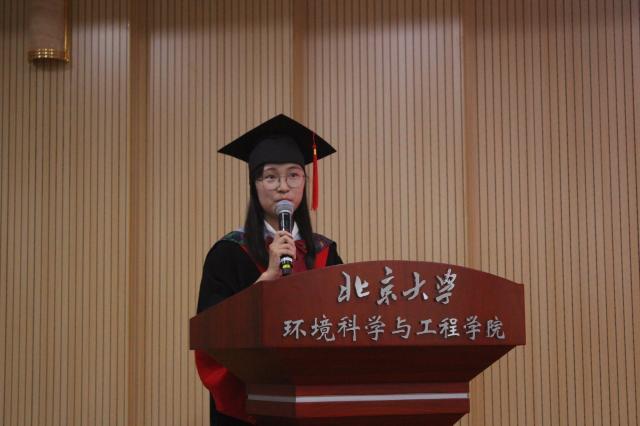 学院2014级博士生杨裕茵作为博士生代表发言。她谈到在环境质量改善的几十年历程中,我们学院的许多老师都参与其中,充分展现了北大人不仅会仰望星空,更会脚踏实地地通过自己的努力让这个国家变得更好。她相信这是对环境人最好的时代,国家政策的支持、前辈老师的引导和很多问题都催促着我们要奋力向前,去承担起北大人的使命。最后,她鼓励我们敢于去梦想一个不再需要“先污染后治理”的世界,梦想着通过预测+政策防患于未然,梦想着可以去解释环境中更细微的物理生物化学过程。
