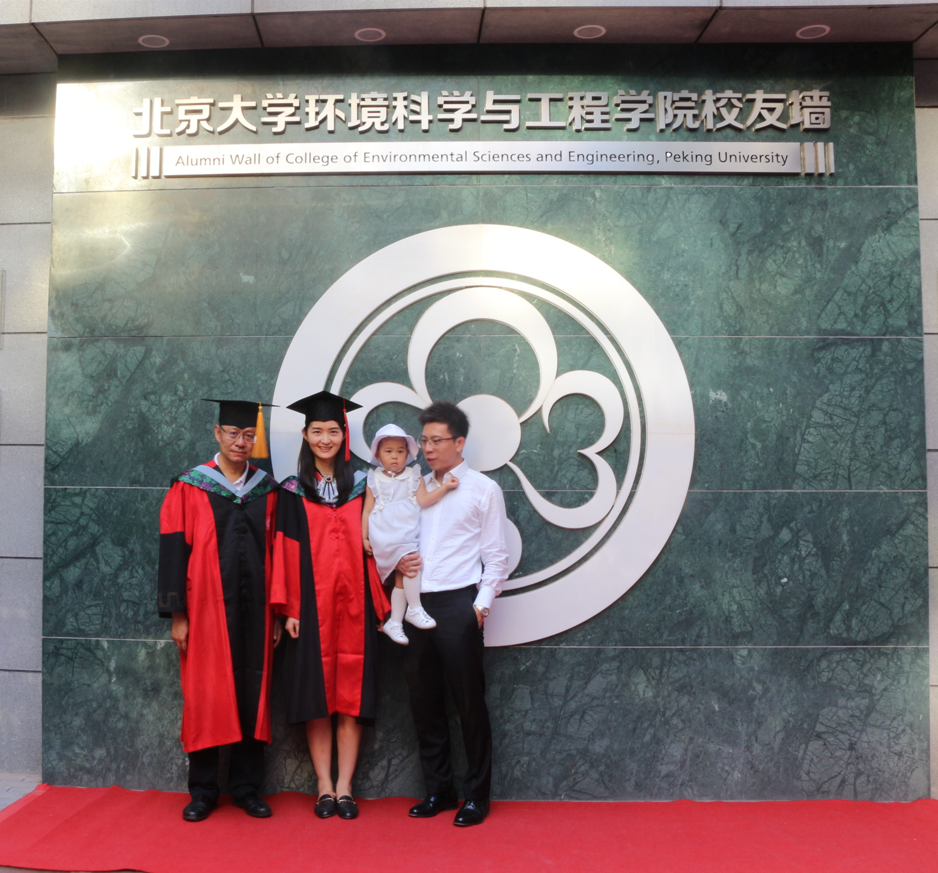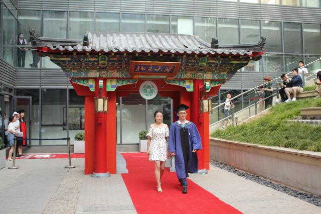 随后,学院毕业生同学们着学位服来到下沉花园,学位授予仪式正式开始。环境科学与工程学院副院长王奇宣读毕业生名单,主持人介绍了各位毕业生的在校情况和毕业去向,在北大毕业季歌曲《转身之间》的深情旋律中,学院本科毕业生、硕士毕业生和博士毕业生依次携手导师、亲友、爱人走上红毯,穿过学位门,并在学位门前驻足合影。走过红毯后,由环境科学与工程学院院长朱彤、党委书记李振山为毕业生同学们拨穗并合影留念。